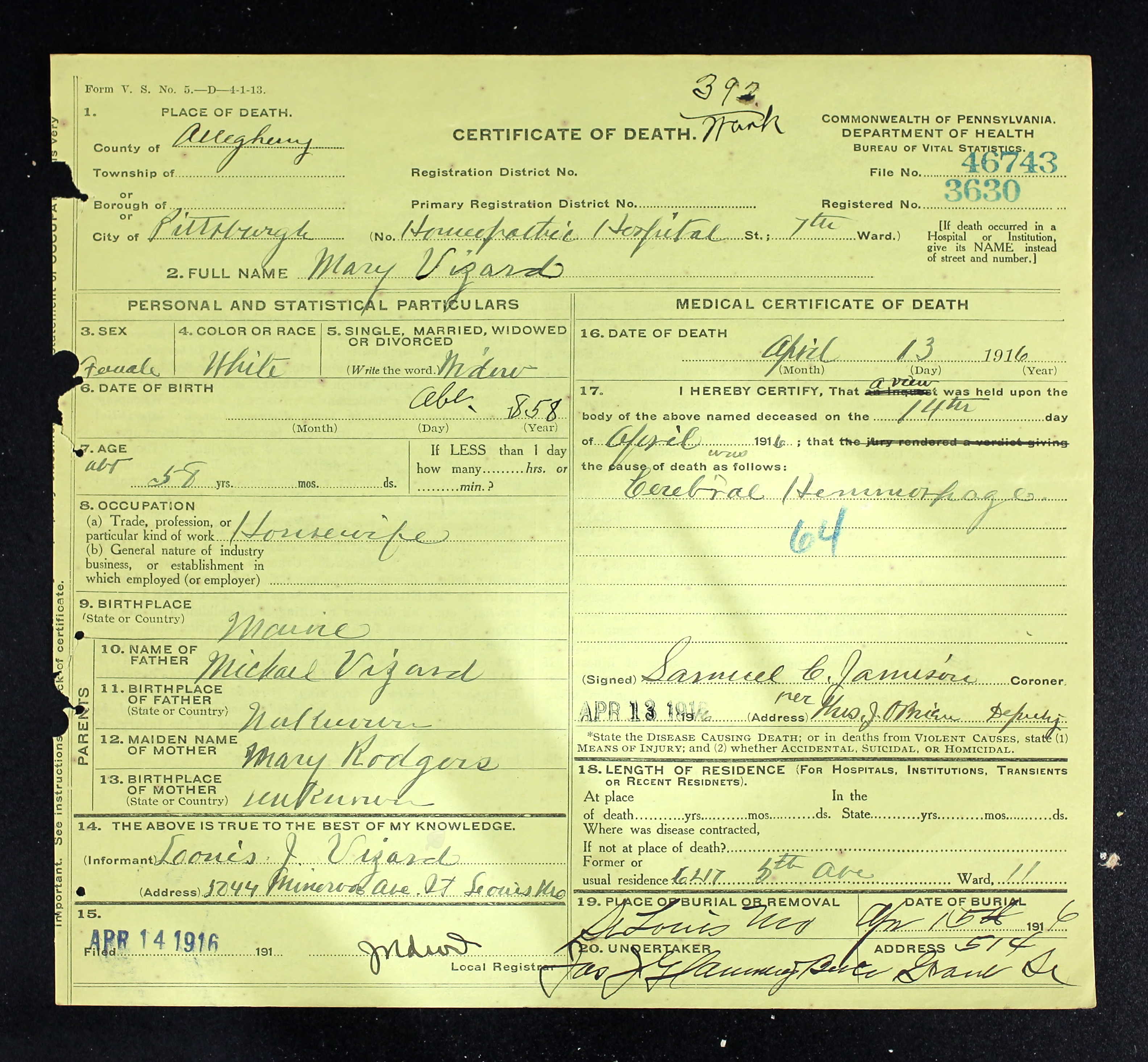 She passed away on 13 April, 1916, while still in the employ of this household, of a cerebral hemorrhage, at the “Homeopathic Hospital”, which is today’s Shadyside Hospital.